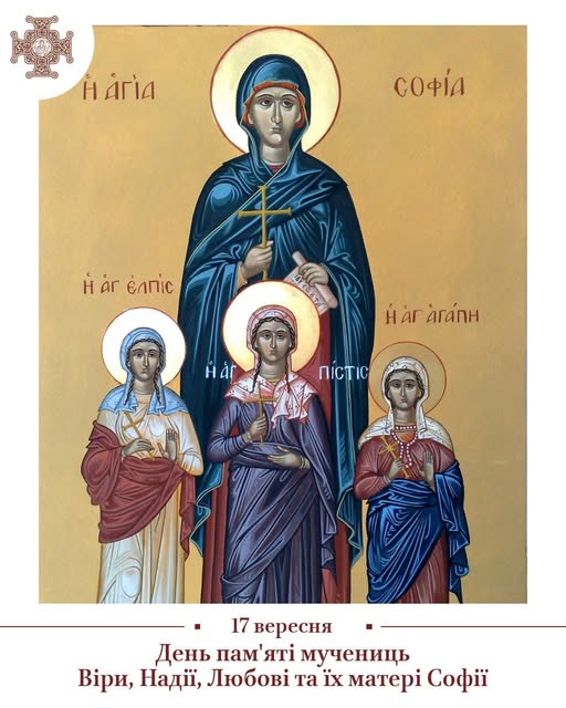 Цього дня вшановуємо пам’ять святої Софії та її трьох дочок – Віри, Надії й Любові. Ці імена символізують головні християнські чесноти, що ведуть людину до справжньої мудрості. Дівчатам було всього 12, 10 і 9 років, коли на їхні плечі випала важка ноша мученицької смерті. Вони жили в Італії за часів імператора-язичника Адріана, походили з заможного роду, але мати, бувши вдовою, виховала їх не в розкоші, а у благочесті та вірі в Христа. Прибувши до Риму, сім’я потрапила в немилість жорстокого правителя. За переказами, Адріан наказав допитувати кожну дитину окремо, сподіваючись хитрощами похитнути їхню віру. Проте ні лагідні обіцянки, ні погрози не зламали віру та силу дівочих сердець. Катування були жорстокими. Софія, стоячи поруч, не благала помилування – вона молилася, щоби доньки не злякалися й не зреклися Христа. У 137 році після Різдва Христового усіх трьох сестер стратили. Матері дозволили поховати їхні тіла за містом. Три дні Софія не відходила від могил і, врешті, сповнена невимовного болю, відійшла до Господа. Імена святих мучениць та їхньої матері нагадують усім нам шлях духовного зростання, яким нам належить йти.