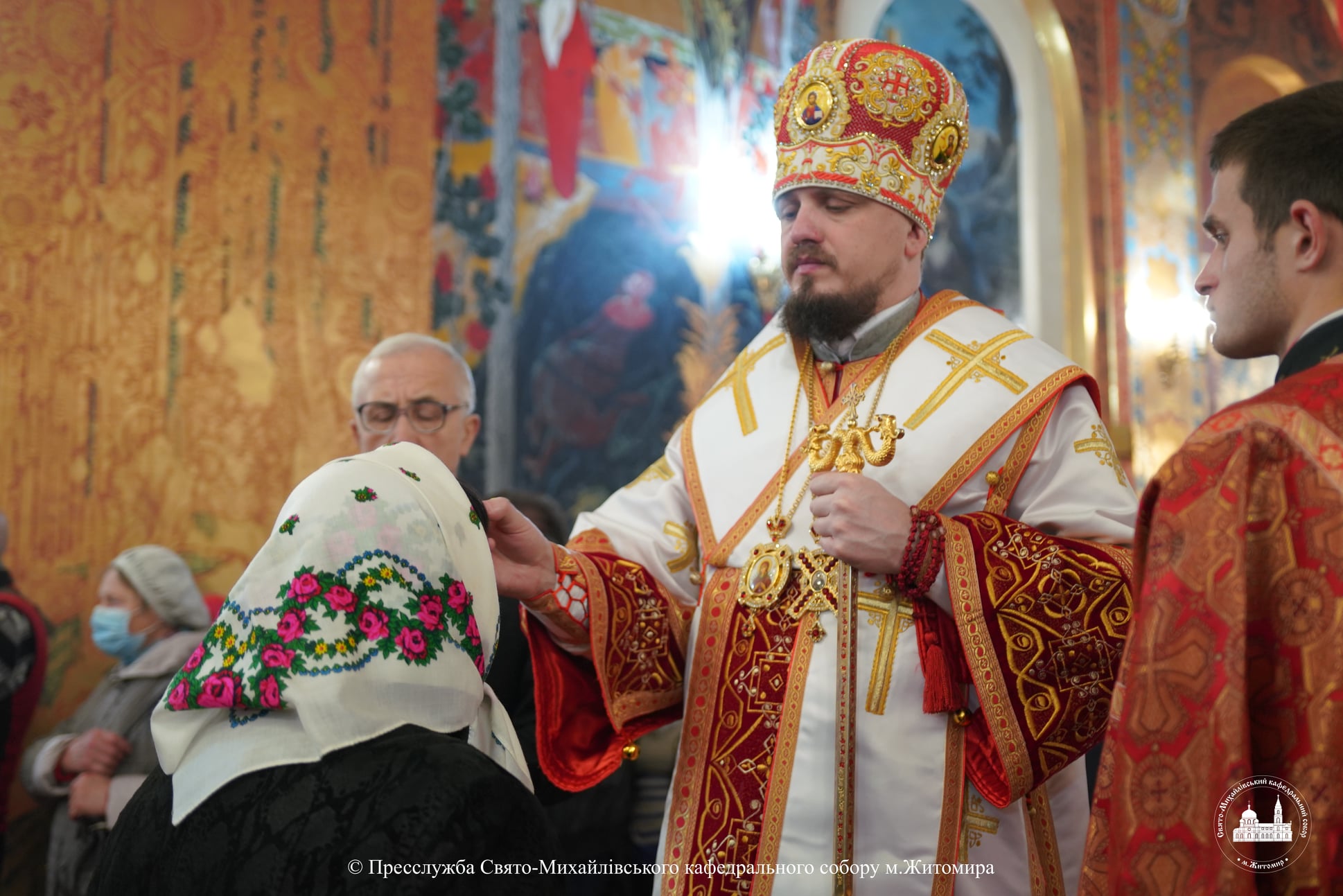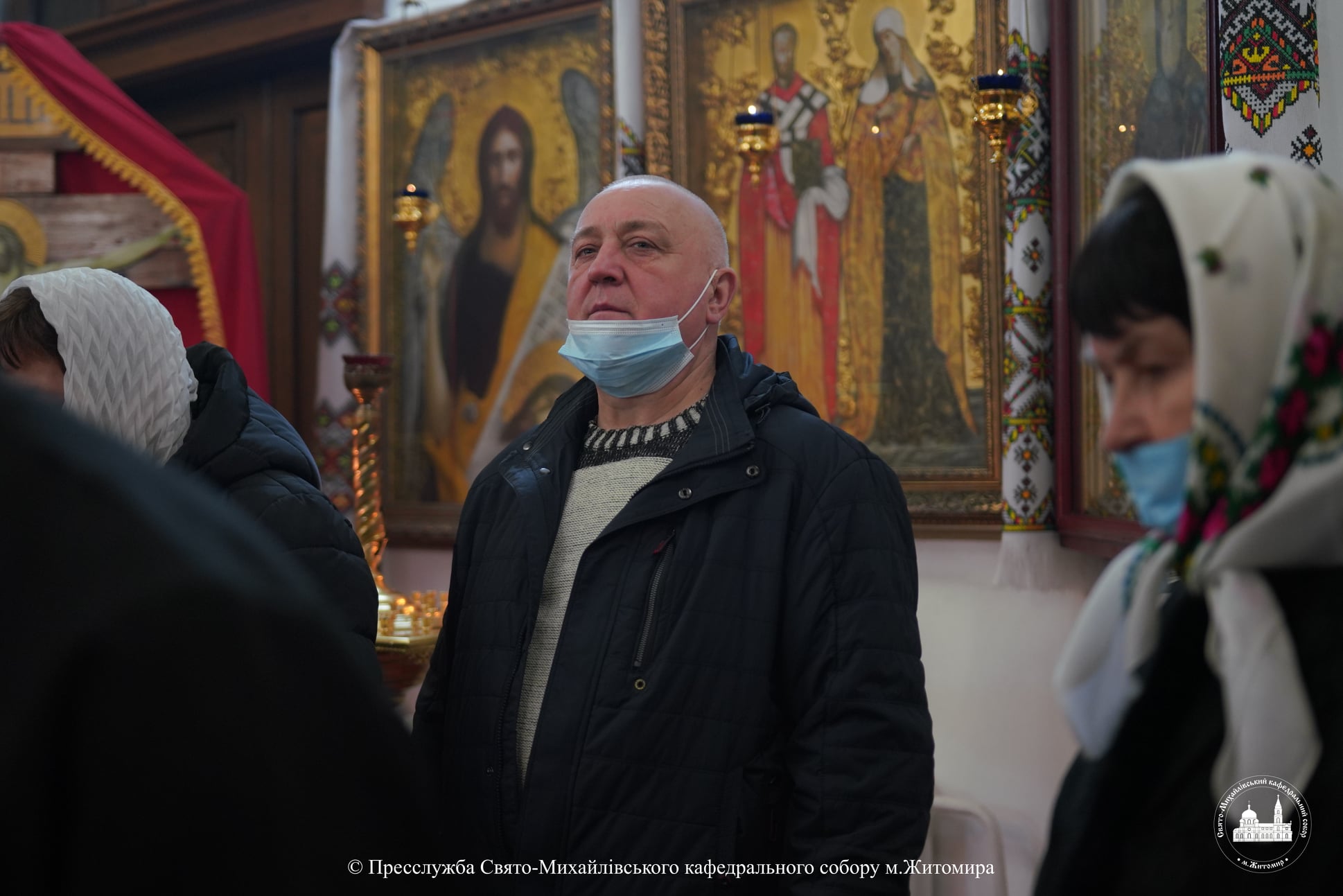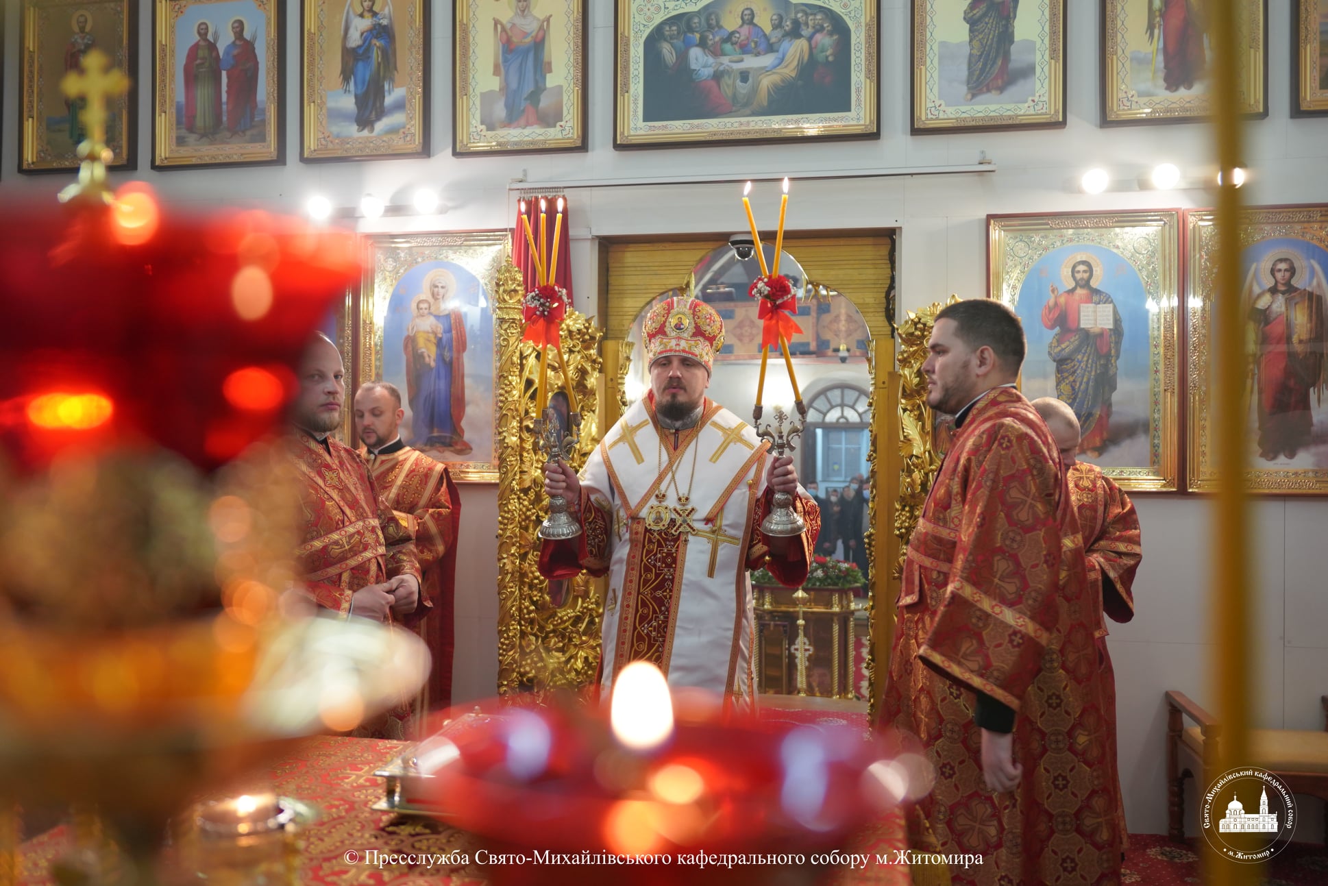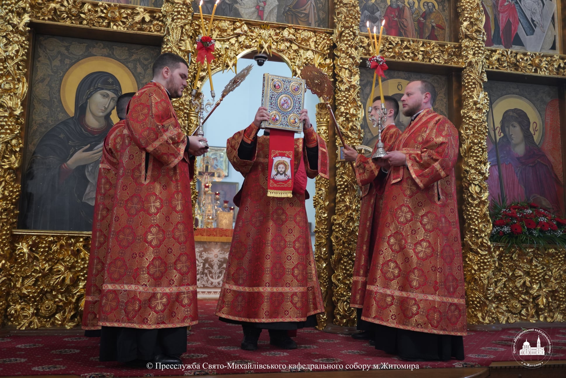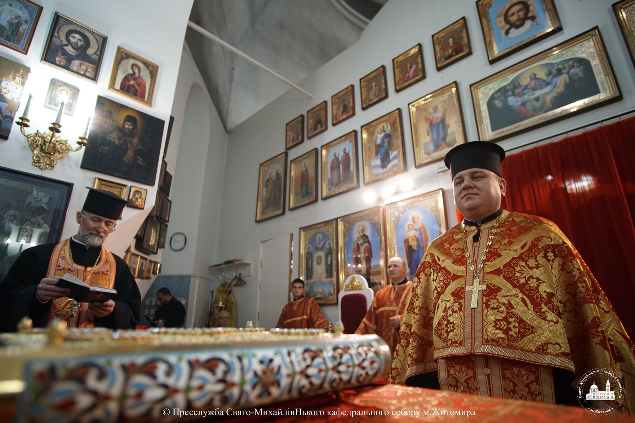 За богослужінням архіпастирю співслужили настоятель Свято-Михайлівського кафедрального собору м. Житомира протоієрей Богдан Бойко, секретар єпархії, настоятель Свято-Георгіївського храму м. Житомира протоієрей Павло Ядчишин, клірики храму та духовенство єпархії.