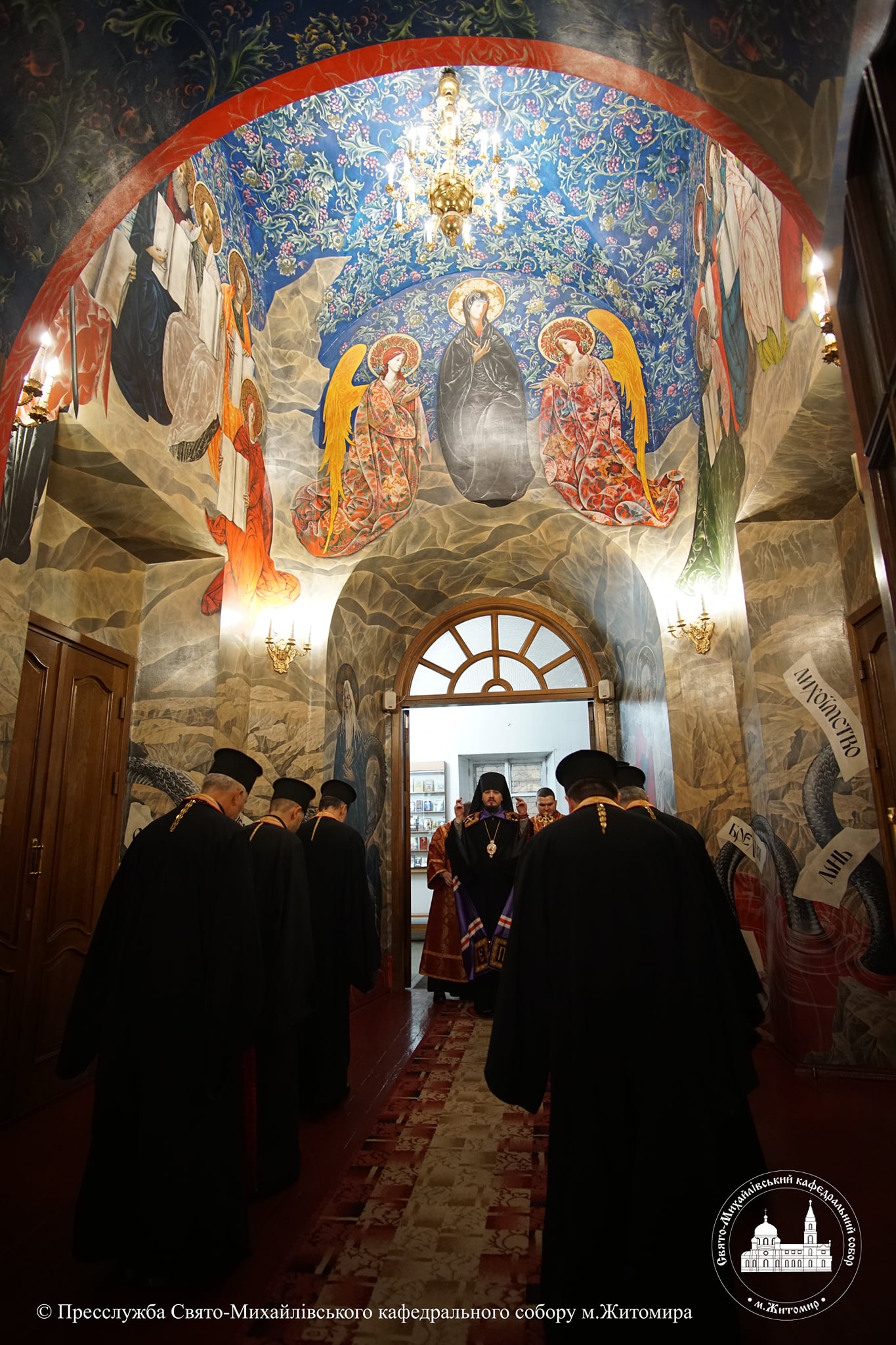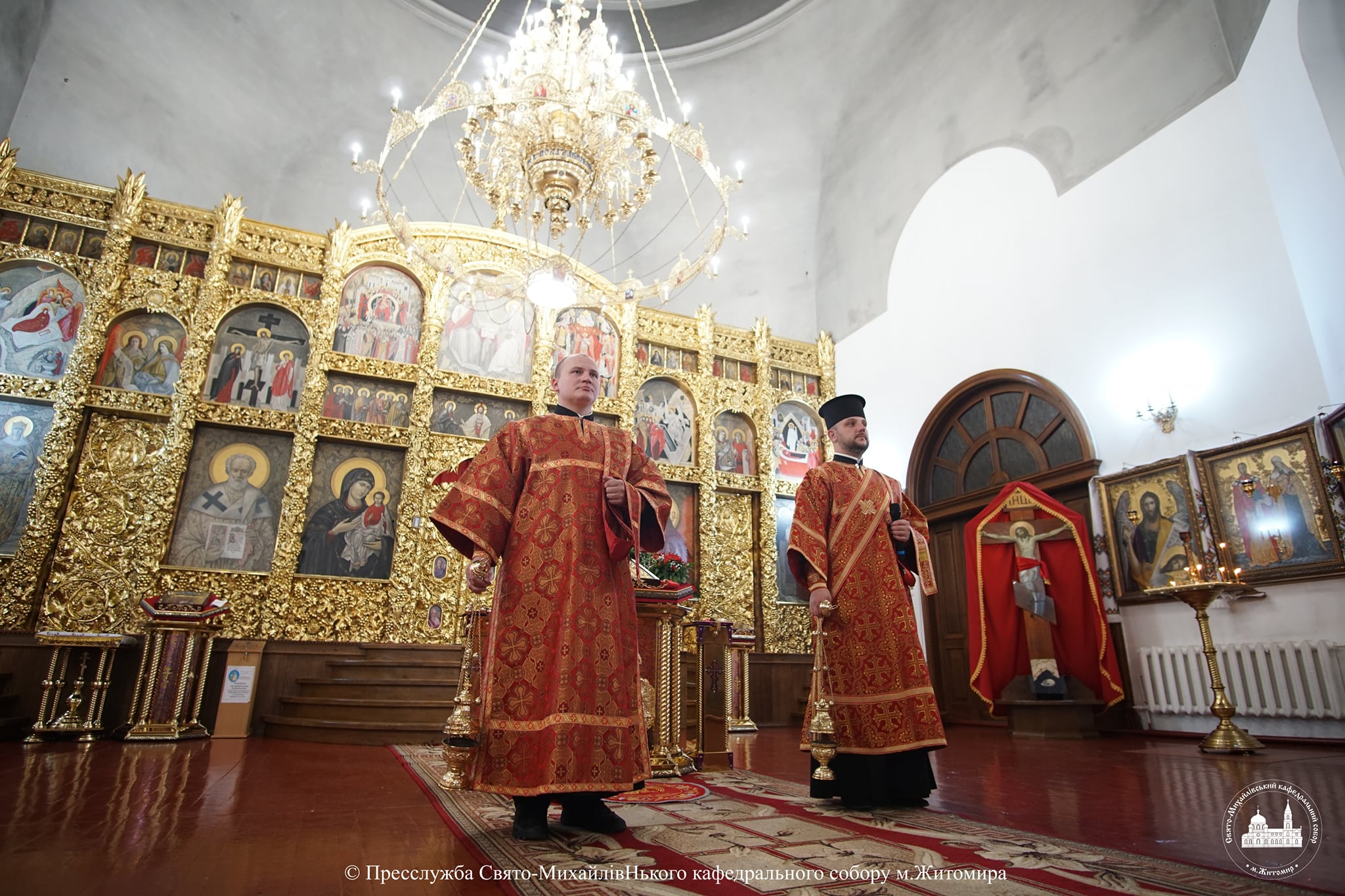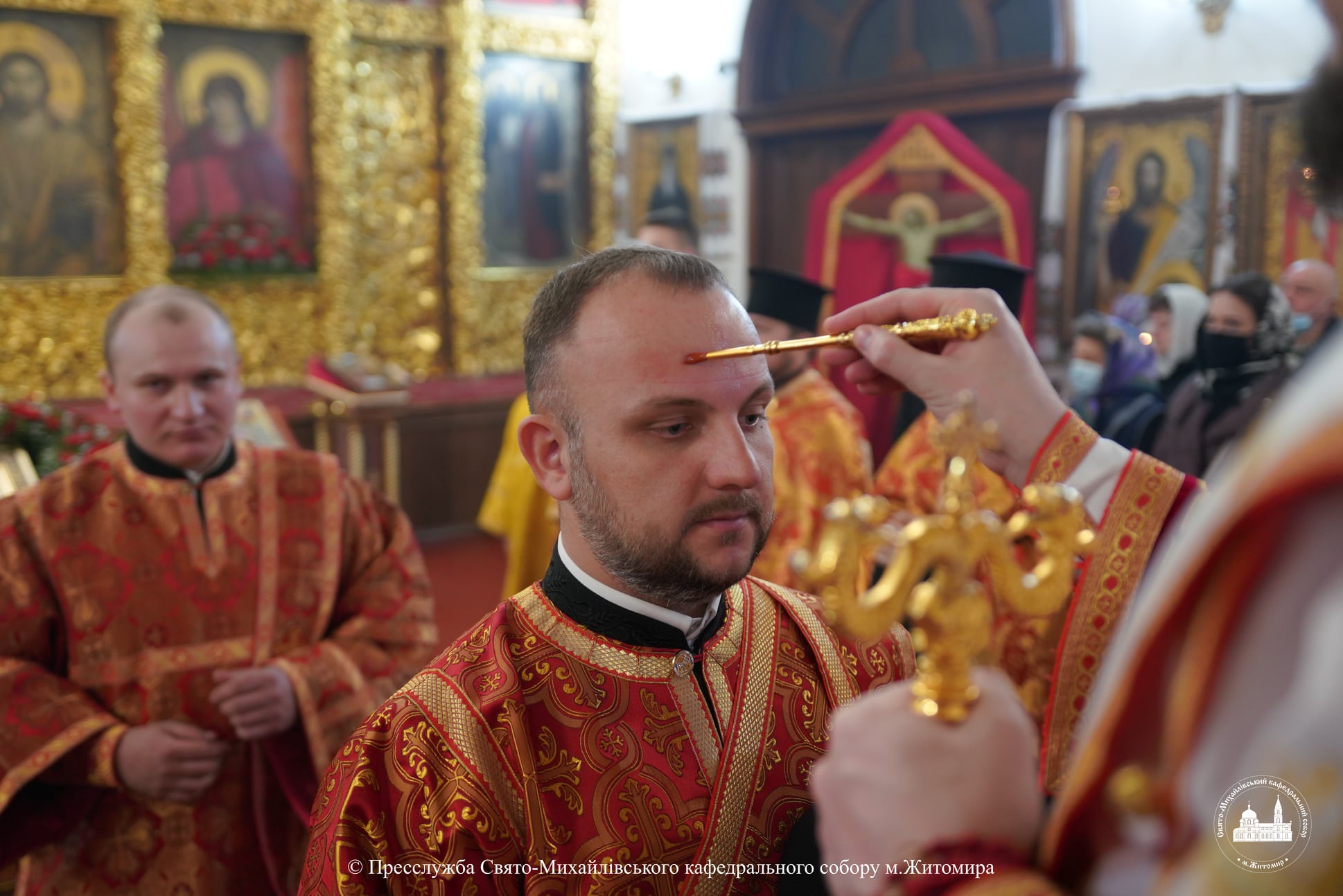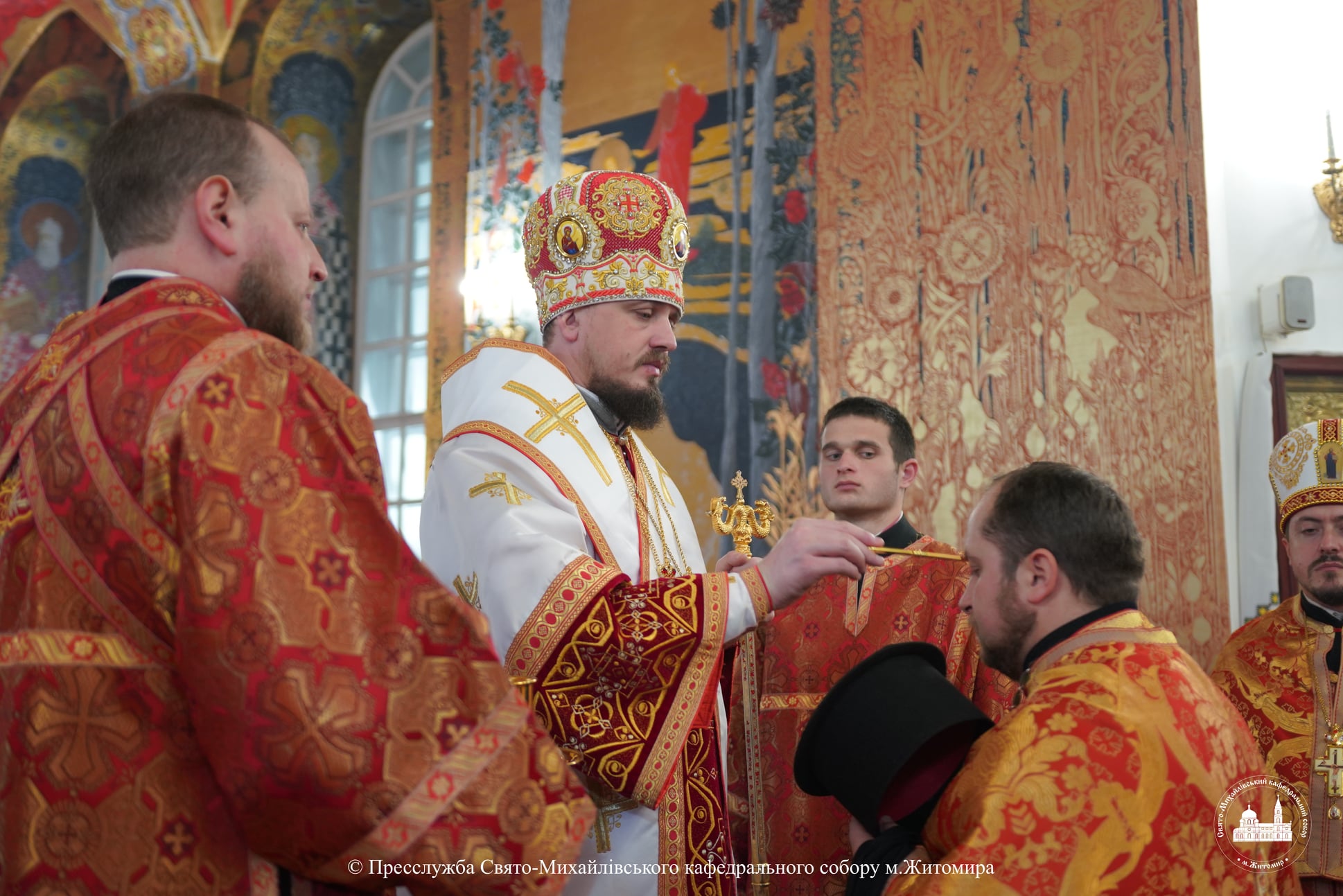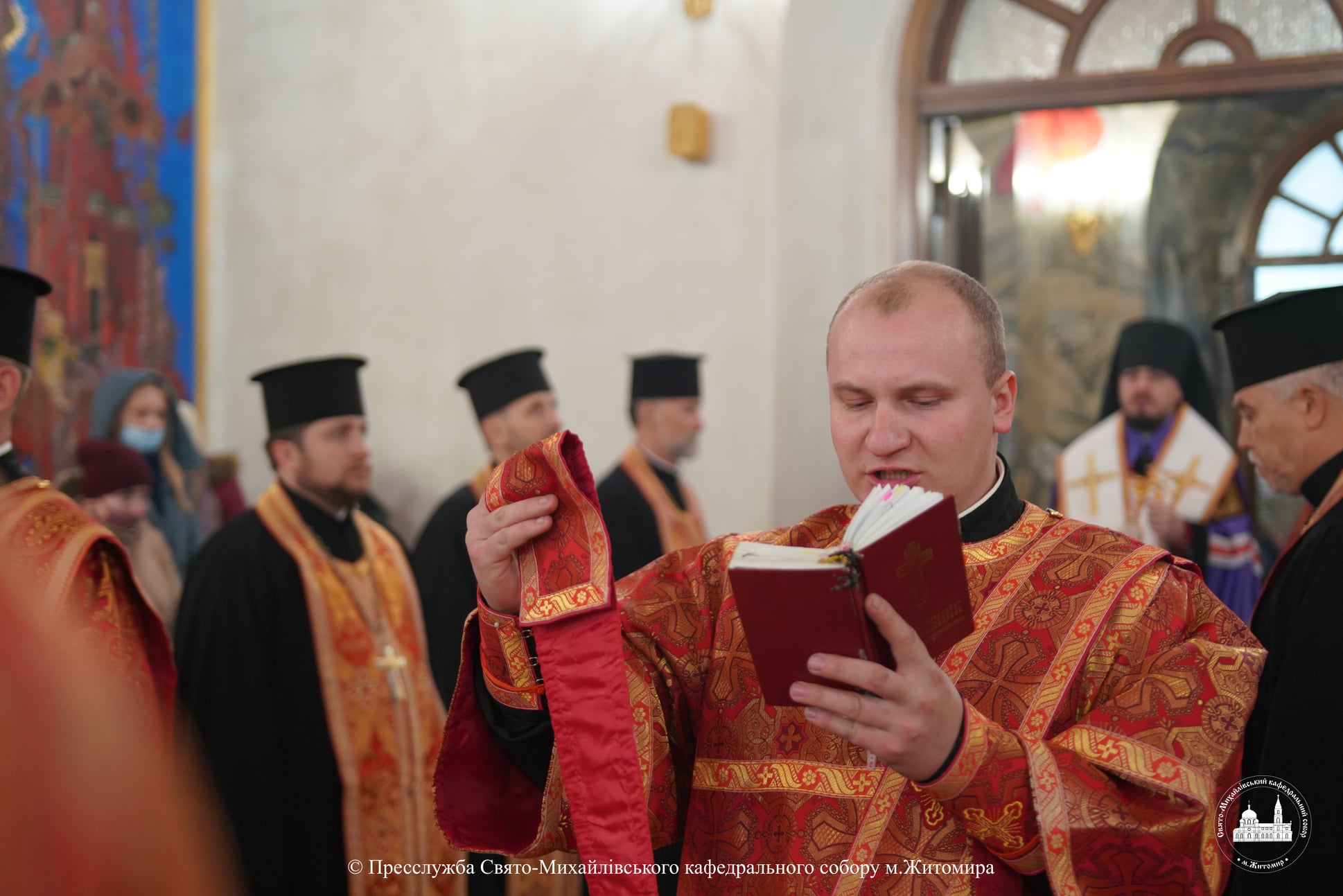 За богослужінням архіпастирю співслужили настоятель Свято-Михайлівського кафедрального собору м. Житомира протоієрей Богдан Бойко, секретар єпархії, настоятель Свято-Георгіївського храму м. Житомира протоієрей Павло Ядчишин, клірики храму та духовенство єпархії.